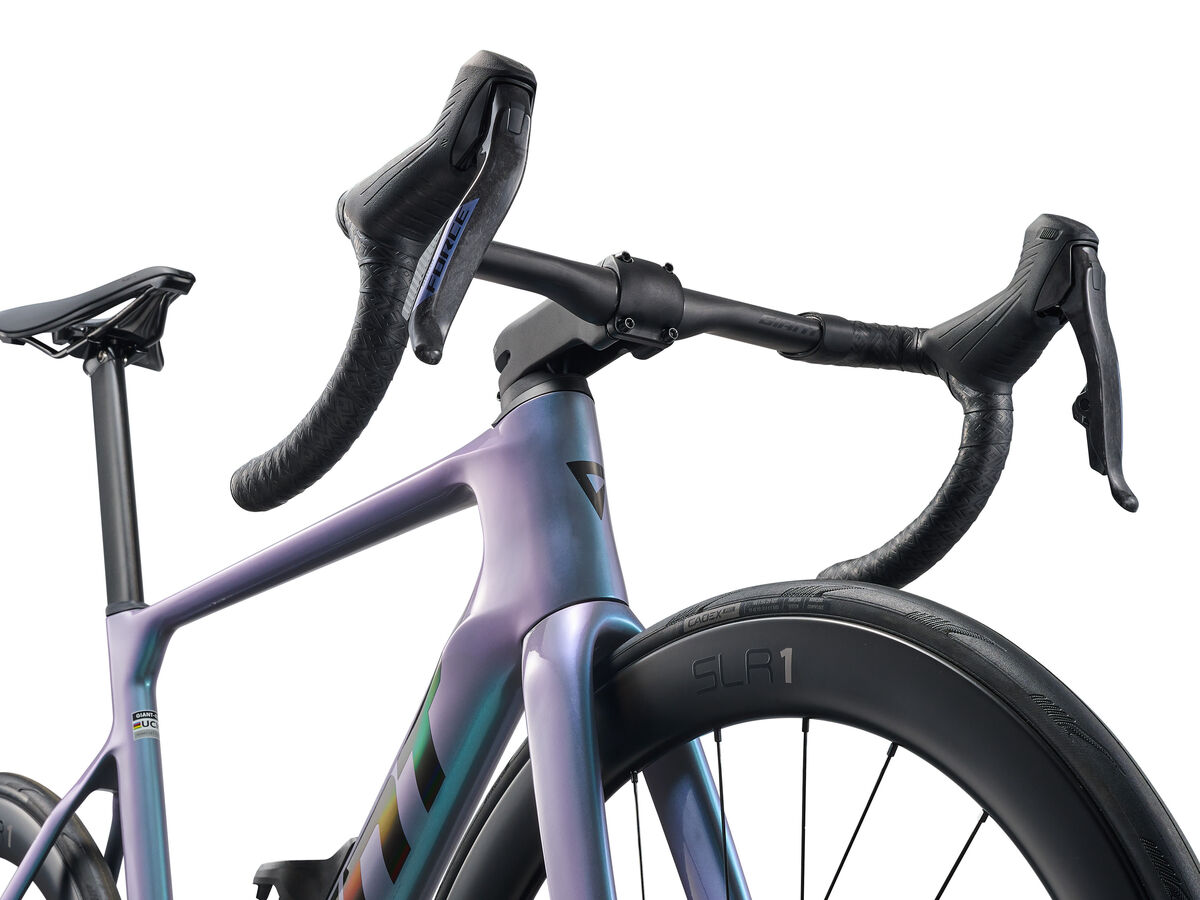 | Style | This aero rocketship is built for speed when it matters most. It's lighter than the previous generation and engineered to slice through wind. The result? Race-winning efficiency that puts you ahead of the pack.Advanced Composite Technology - Giant's High Performance Grade raw carbon material is used to produce this custom frame material in our own composite factory with a high stiffness-to-weight ratio. The front triangle of these framesets is assembled and molded as one continuous piece in a proprietary manufacturing process called Modified Monocoque Construction. AeroSystem Shaping Technology - Through CFD (Computational Fluid Dynamics) and wind-tunnel data, engineers optimize each tube shape to deliver superior aerodynamic performance. OverDrive Aero - Found inside the head tube of the Defy, Propel and TCR ranges, the D-shaped fork steerer tube and corresponding spacers provide an extremely aerodynamic, easier to service system of internally routed brake and derailleur cables. Tubeless System - Fewer flat tires. Greater traction. Less rolling resistance and a smoother, faster ride. Giant's Tubeless System makes it easier than ever to experience all these benefits. Specifications:Sizes S, M, M/L, L, XLColours Prismatic Haze/Iris Frame Advanced-grade Composite, 12x142mm thru-axle, disc Fork Advanced SL-grade Composite, full-composite OverDrive Aero steerer, 12x100mm thru-axle, disc Handlebar Giant Contact SLR Aero XS:38cm, S:38cm, M:40cm, M/L:40cm, L:42cm, XL:42cm Grips Stratus Lite 2.0 Stem Giant Contact SL Aero XS:80mm, S:90mm, M:100mm, M/L:110mm, L:110mm, XL:120mm Seatpost Giant Vector, composite, -5/+15mm offset Saddle Giant Fleet SL Pedals PEDALS NOT SUPPLIED Shifters SRAM Force AXS E1 Front Derailleur SRAM Force AXS E1 Rear Derailleur SRAM Force AXS E1 Brakes SRAM Force E1 hydraulic, SRAM PaceLine X rotors [F]160mm, [R]140mm Brake Levers SRAM Force AXS E1 Cassette SRAM Force, 12-speed, 10x33 Chain SRAM Force E1 Crankset SRAM Force E1 DUB, 35/48 with power meter XS:165mm, S:165mm, M:170mm, M/L:170mm, L:172.5mm, XL:172.5mm Bottom Bracket SRAM, press fit Rims Giant SLR 1 50 Carbon Disc WheelSystem, [F]50mm, [R]50mm Hubs [F] Giant Low Friction Hub, CenterLock, [R] Giant Low Friction Hub, 30T ratchet driver, CenterLock, 12mm thru-axle Spokes Sapim Tyres CADEX Road Race GC, tubeless, 700x28c, folding Extras computer mount, bottle cages, tubeless prepared, 32mm max tire size Max Tyre Clearance 32mm |