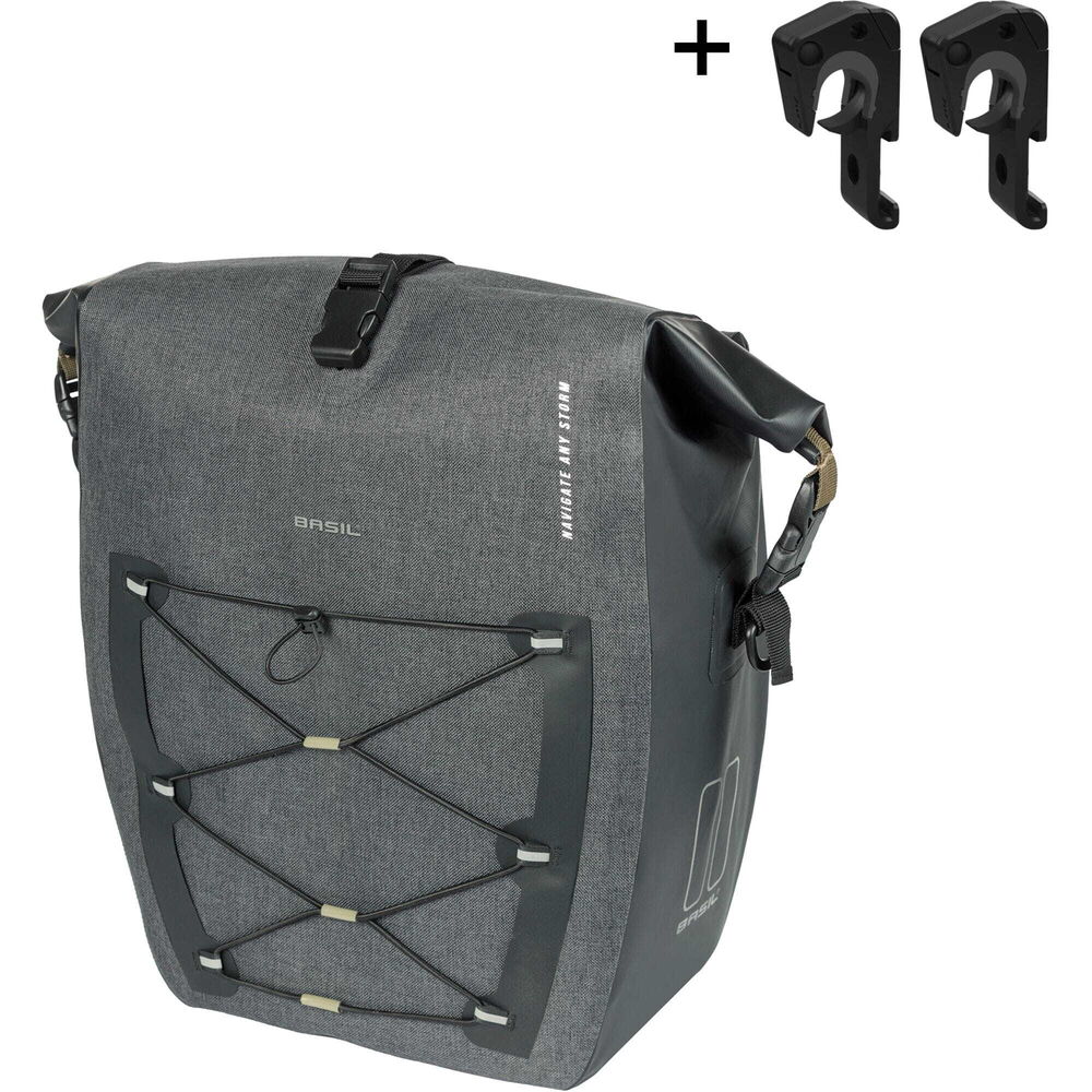 With the Basil Navigator Storm bicycle bag, you choose a sporty and functional single bicycle bag. With this bag, you can tackle any adventure. 100% waterproof The bag is made of high-quality waterproof (IPX3) fabric. The functional design ensures that this bag can easily carry everything you need. Everything has been thought of to make it possible to take your belongings wherever you go in the most practical way. For example, there is room for a bicycle helmet thanks to the adjustable elastic cord. The bicycle bag can be easily closed with the roll-top closure. This roll-top closure can be attached in three ways. Traveling in the dark? No problem! With the reflective Basil logos on 3 sides, you'll be visible even then. Hence, you are always prepared for the road. Attaches effortlessly to your luggage carrier with MIK Hooks system. The removable shoulder strap allows you to turn this bicycle bag into a shoulder bag in no time