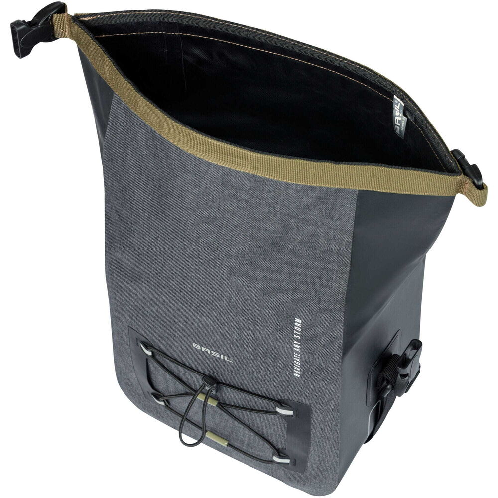 The handlebar bag is made of waterproof polyester and tarpaulin, so it will last for years to come on your bike rides. The bag has a sporty look and fits perfectly with the other bags in the Navigator Storm collection. Everything has been thought of to ensure your belongings are carried as practically as possible. For example, an adjustable elastic cord, zipper, and mesh pocket are on the inside of the bag, and the handlebar bag can be easily closed with the roll-top closure. You'll never lose your keys again, thanks to the snap-hook. Out for a ride in the dark? No problem! The reflective Basil logos on 3 sides make you better visible.