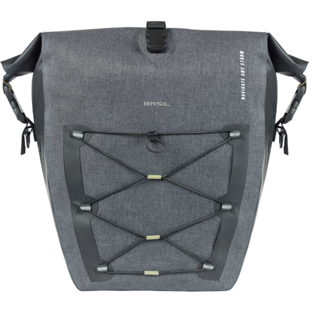 With the Basil Navigator Storm bicycle bag, you choose a sporty and functional single bicycle bag. With this bag, you can tackle any adventure. 100% waterproof The bag is made of high-quality waterproof (IPX3) fabric. The functional design ensures that this bag can easily carry everything you need. Everything has been thought of to make it possible to take your belongings wherever you go in the most practical way. For example, there is room for a bicycle helmet thanks to the adjustable elastic cord. The bicycle bag can be easily closed with the roll-top closure. This roll-top closure can be attached in three ways. Traveling in the dark? No problem! With the reflective Basil logos on 3 sides, you'll be visible even then. Hence, you are always prepared for the road. Attaches effortlessly to your luggage carrier with MIK Hooks system. The removable shoulder strap allows you to turn this bicycle bag into a shoulder bag in no time